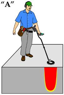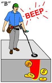 Illustration 'B' shows what happens when the detector user's metal detector search pattern comes in contact with metal objects, in this case both shallow and deep coins. When the search pattern touches metal it interrupts the transmitted signal and this interruption or disturbance of the search pattern will cause the metal detector to alert the detector user (you) with an audio signal, usually a distinct loud sound. In some cases flashing or blinking lights will accompany the audio signal. Simple isn't it?