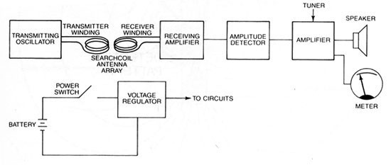 This electronic block diagram of a transmitter-receiver metal detector illustrates the basic
