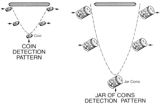 Fringe area detection is a phenomenon of detection, the understanding of which will result in your being able to discover metal targets to the maximum depth capability of any instrument. The detection pattern for a coin may extend, say, one foot below the searchcoil. The detection pattern for a small jar of coins may extend, perhaps, two feet below the searchcoil as illustrated in the drawing on the facing page. Within the area of the detection pattern, an unmistakable detector signal is produced.