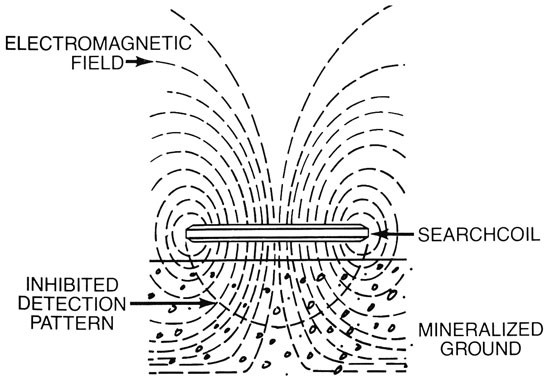 The detection of non-conductive iron (ferrous) minerals takes place in a different manner. When iron mineral comes near and within the detection pattern, the electromagnetic field lines are redistributed, as shown in the figure on the following page. This redistribution upsets the “balance” of the transmitter and receiver windings in the searchcoil, resulting in power being induced into the receiver winding. When this induced power is sensed by the detector circuits, the detector alerts its operator to the presence of the iron mineral. Iron mineral detection is a major problem for both manufacturers and users of metal detectors. Of course, the detector of iron mineral is welcomed by a gold hunter who is looking for black magnetic sand which can often signal the presence of placer metal. On the other hand, the treasure hunter, who is looking for coins, jewelry, relics, gold nuggets, etc., usually finds iron mineral detection a nuisance.