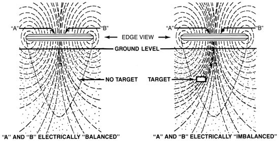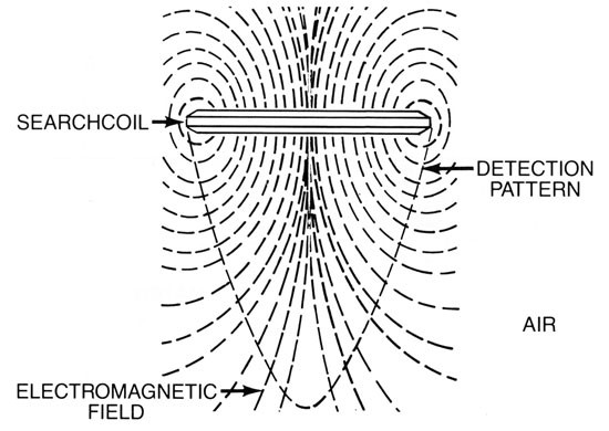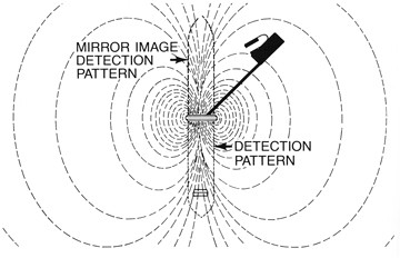 As the current circulates in the transmitter antenna, an invisible electromagnetic field is generated that flows out into the air (or other surrounding medium, i.e.: air, wood, rock, earth materials, water, etc.) in all directions. If this electromagnetic field were visible, it would appear to be in the shape of a gigantic, three dimensional doughnut, with the transmitter antenna embedded in its center. Electromagnetic field theory states that field lines cannot cross one another. Consequently, they crowd together as they pass through the circular antenna, but they are not crowded on the outside. It is fortunate this crowding takes place, because the intensity (density) of the field lines is the very phenomenon that enables metal detection in the area adjacent to the search coil to take place. In the drawing at the bottom of the next page note the area indicated as the two dimensional detection patterns. This is the site of maximum field crowding; it is here that metal detection occurs as a result of two major phenomena…eddy current generation and electromagnetic field distortion. (Note the Mirror-image detection pattern above the search coil.)