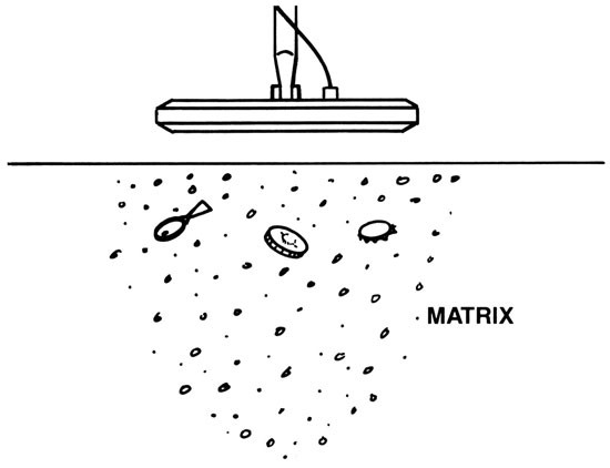 “Coupling” describes the penetration of the electromagnetic field into any object near the transmitter antenna. There is perfect coupling into some objects such as wood, fresh water, air, glass, and certain non-mineralized earth materials as shown in the drawing below. Coupling is inhibited, however, when the electromagnetic field attempts to penetrate iron mineralization, wetted salt, and other substances. This inhibiting of the electromagnetic field, as shown in the drawing on the facing page decreases the detection capability of the metal detector. Even though modern instruments can eliminate the effects of iron minerals, the electromagnetic field is still inhibited (distorted), which results in reduced detection capability and performance.