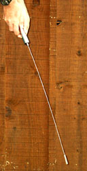 The high tensile spring rod allows easy observance of the slightest dowsing response. You either follow the direction of the swing or use the method of triangulation. When you think you are over the top of your target, hold the instrument straight down as in "Finding The Direction" and watch to see if the end of the instrument operates in a circular pattern.