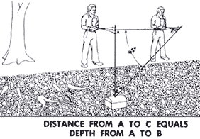 To estimate the depth of your treasure, hold the depth rod horizontally as in the bottom most photo. First try it directly over the spot and observe to see if it bobs straight up and down. Then move out to the side from that spot, and keep taking readings until you see the tip of the instrument bobbing at an angle of 45 degrees, as shown in the drawing. You can estimate the depth of your treasure to be equal to the distance from the center point to the place where the tip bobbed at a 45 degree angle, less about 3.5 feet.